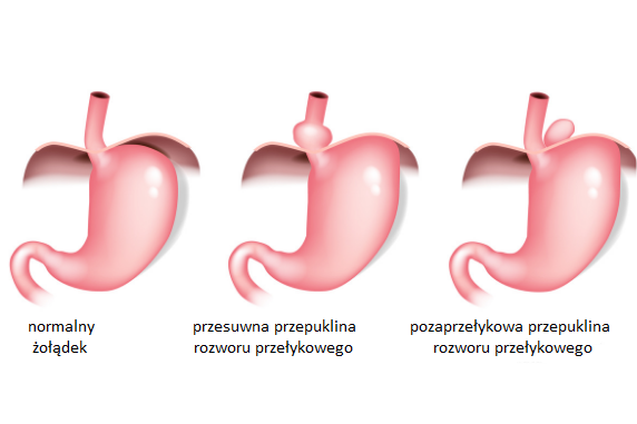 Wyróżniamy kilka typów przepukliny rozworu przełykowego. Najczęstszy to typ I (ślizgowy), gdzie połączenie żołądka z przełykiem przemieszcza się powyżej przepony. Typ II (przyosiowy) charakteryzuje się tym, że dno żołądka przesuwa się przez rozwór, podczas gdy połączenie pozostaje na swoim miejscu. Istnieją również typy mieszane, które łączą cechy obu poprzednich.